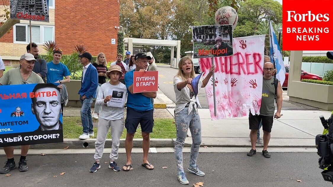 Anti-Putin-Demonstranten demonstrieren vor dem russischen Konsulat in Sydney, Australien
