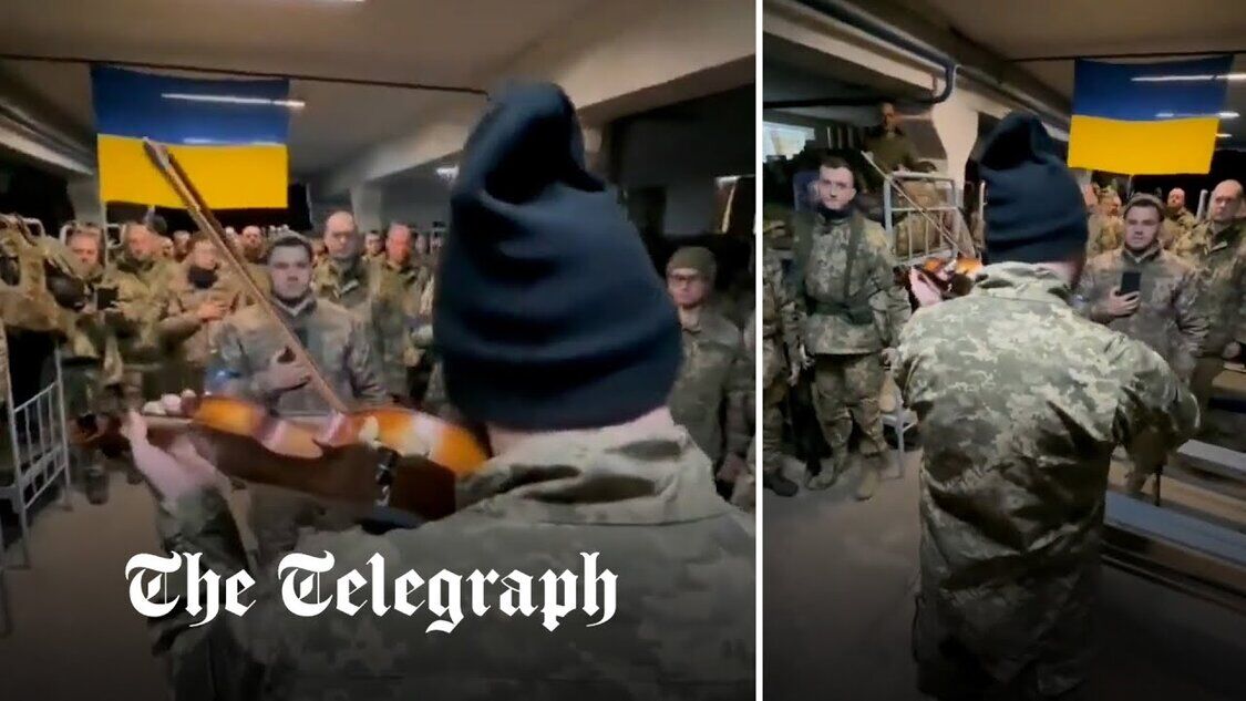 Der ukrainische Soldat spielt auf der Geige die Nationalhymne als Symbol der Hoffnung im Krieg gegen Russland