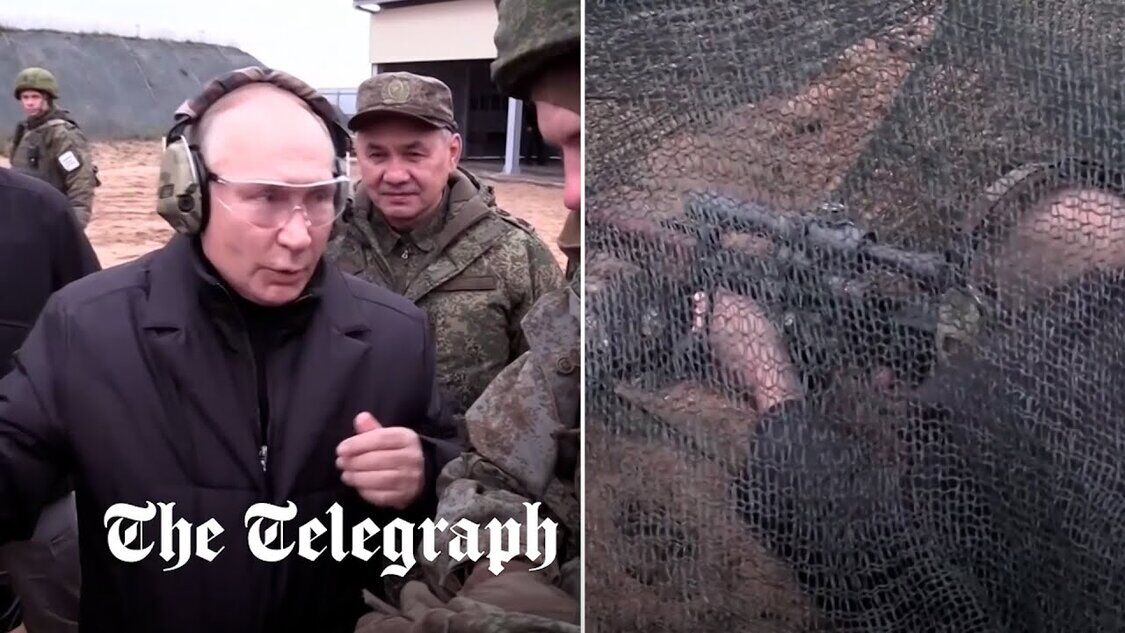 Wladimir Putin feuert mit einem Scharfschützengewehr auf einen russischen Truppenübungsplatz
